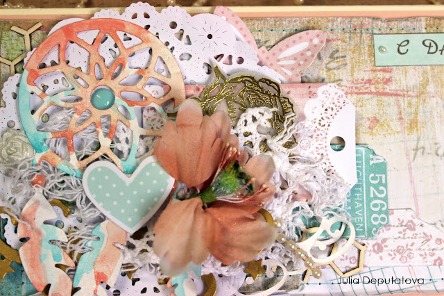 Использовала материалы от разных приводителей. Здесь и высечки от ScrapМир, Fleur, бумага K&Co, наклейки от Melissa Frances, эмалевые точки Magic hobby, вырубка, Примовские цветы, гипсовые украшения..